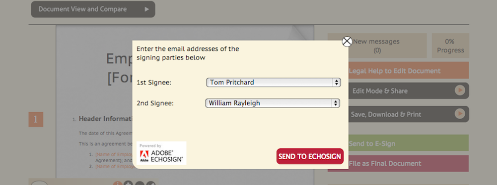 The website lets users search for contracts from a wide range of categories - Commercial and Private. Once a contract is selected by the user, they can then invite other collaborators to work on the document. To facilitate this joint drafting process, the platform provides the users with a messaging service and lets users save different versions of the document and view progress. The collaborators can be assigned different roles granting a few users permission to modify the contract while others view progress and comment on the document. Once a contract is marked as complete, a Lawbite lawyer can be invited to go over the document via the platform. The final step is to get the document signed. Lawbite provides e-Signing functionality to complete the contract and move ahead quickly. The Lawbite database safely and securely stores the signed copy of the contracts and can alert the user prior to renewal or expiry.